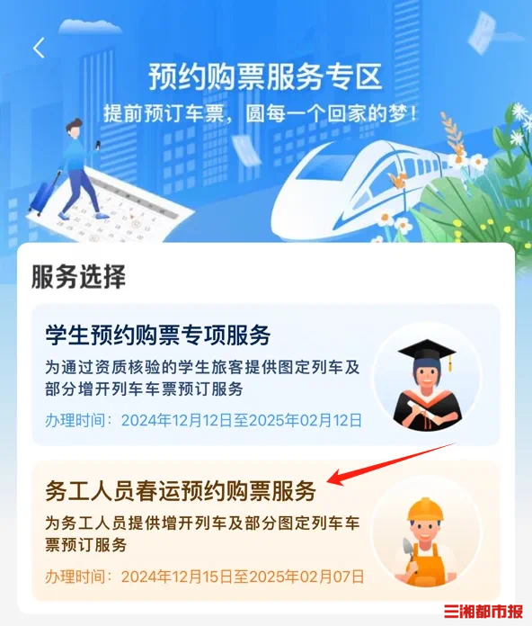 三湘都市报12月15日讯(全媒体记者 李致远)12月15日,铁路12306手机客户端务工人员预约购票服务上线,符合条件的旅客朋友可通过专区预约购买2025年春运期间往返车票,重点群体旅客春运出行将更加便利。