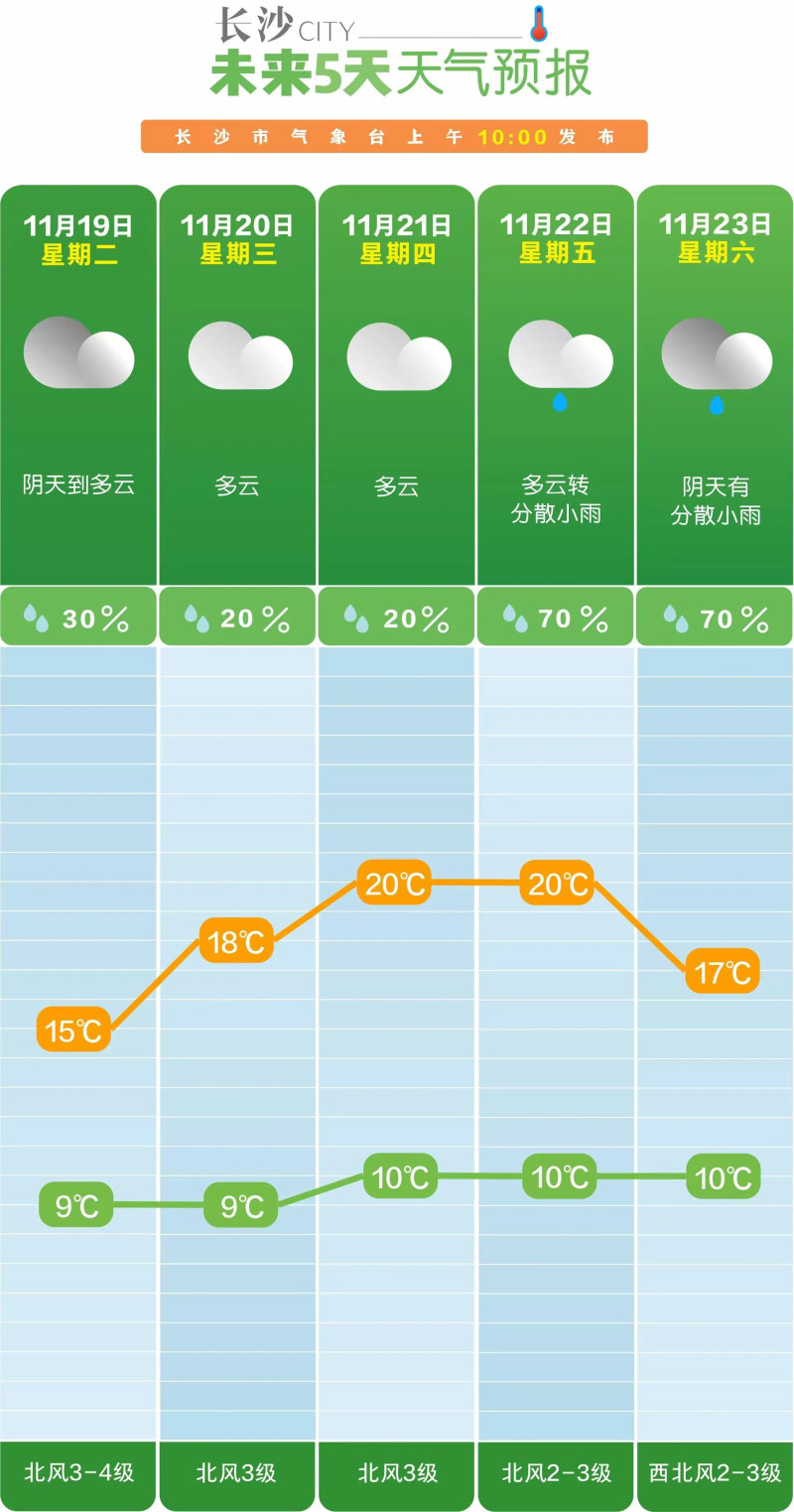 市气象台预计,19日长沙阴天到多云,气温9℃至15℃;一直到21日,偏北气流控制,长沙多云为主;22日到24日,部分时段有分散小雨;24到25日,强冷空气南下,北风加大至4到5级、阵风6到7级,气温下降6℃至8℃,并伴有小到中雨。具体来看,20日,长沙多云,北风3级,9℃至18℃;21日,长沙多云,北风2到3级,10℃至20℃;22日,长沙多云转分散小雨,北风2到3级,10℃至20℃;23日,长沙阴天有分散小雨,北风2到3级,10℃至17℃;24日,长沙小到中雨,9℃至13℃;25日,长沙小雨转多云,6℃至10℃。