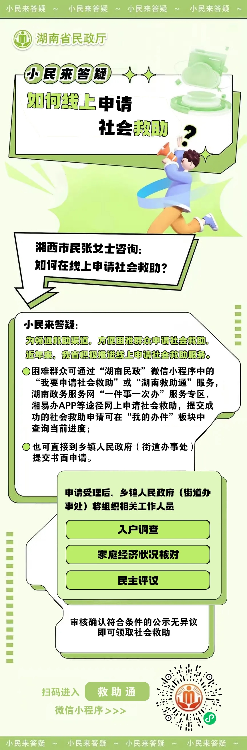 扫描下方二维码直接进入“湖南救助通”,或进入“湖南民政”小程序,在【便民服务】板块—【湖南救助通】模块,任意点击一项业务,即跳转到“救助通”。